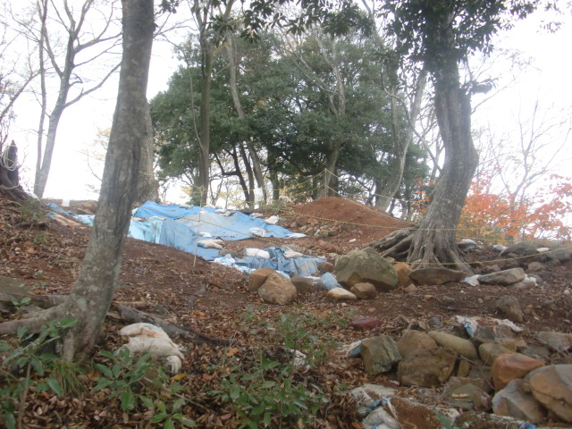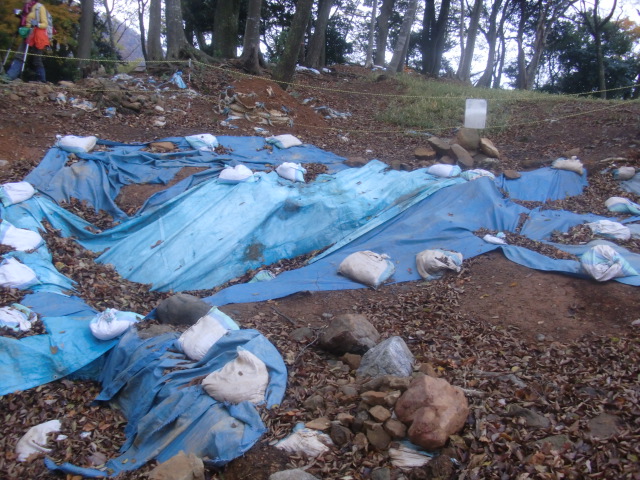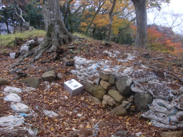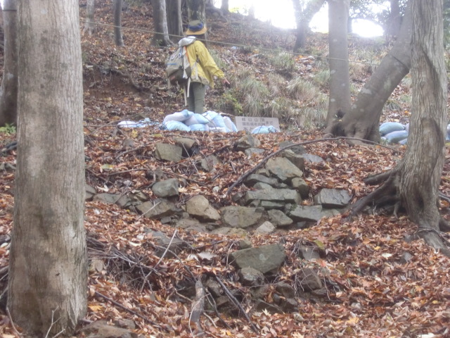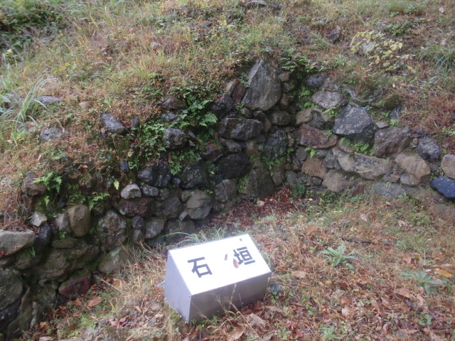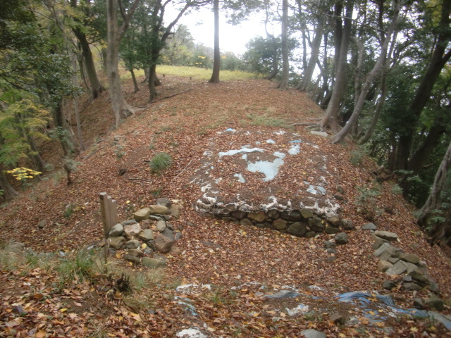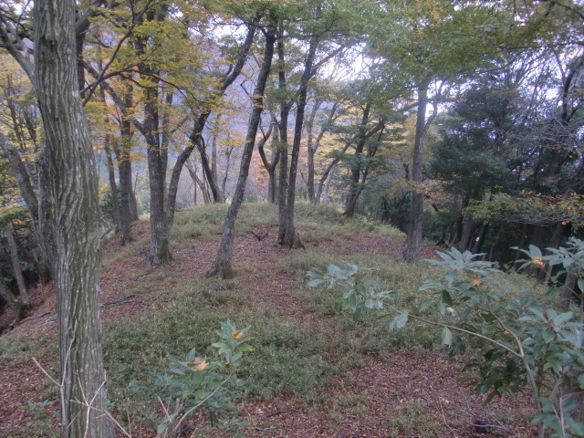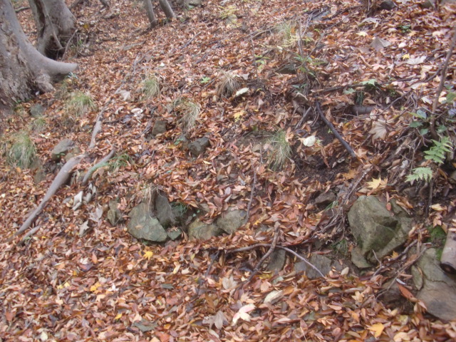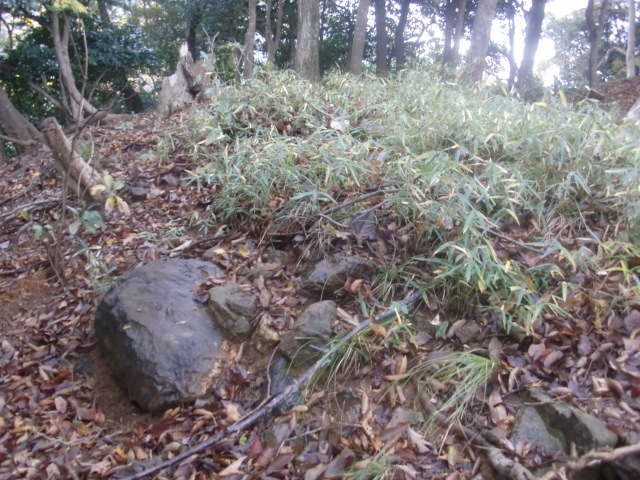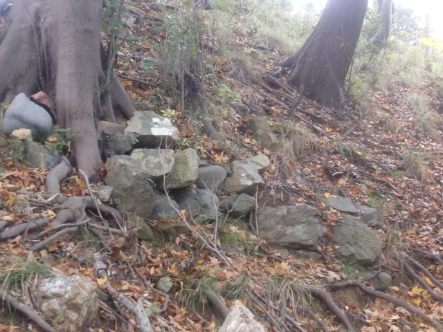 主郭へと戻らず斜面を北に進むと北東尾根側にも小振りな郭が続き石積み痕跡も・・・